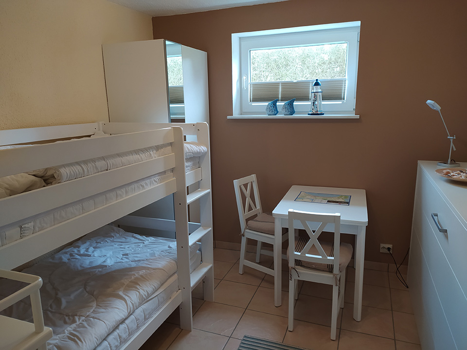 Schlafzimmer mit Doppelbett, dreitüriger Kleiderschrank, zwei Nachtschränke, zwei Stühle, Waschbecken. Zweites Zimmer mit zwei Betten sowie zwei Schränke, Tisch und zwei Stühle.